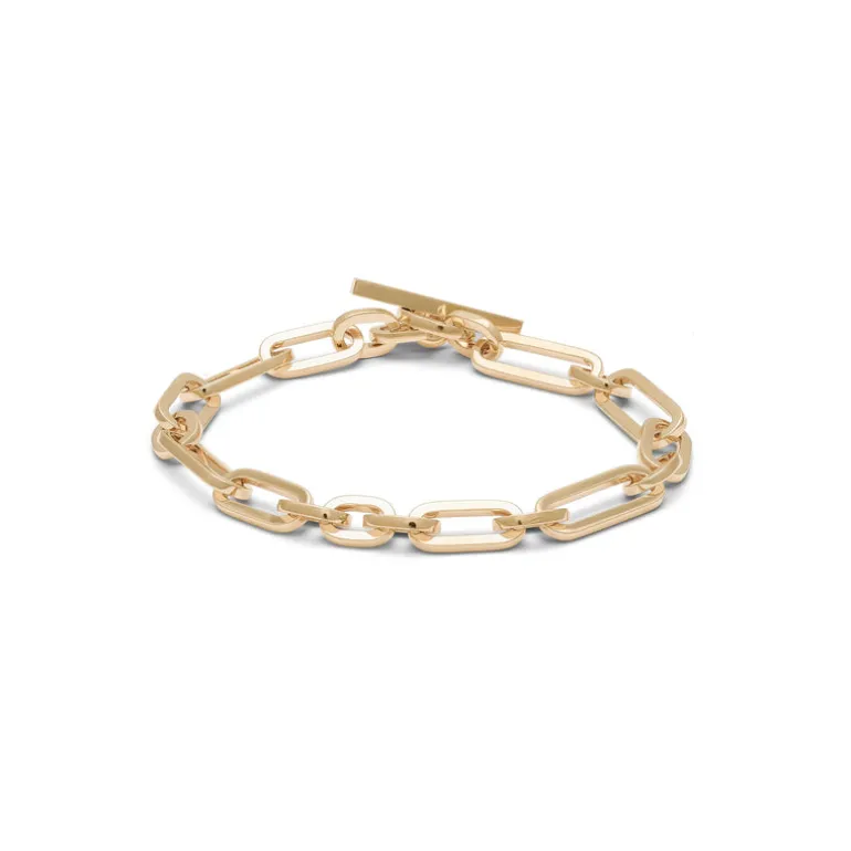 Embracing the design of the interlocking links of varying sizes, the solid 18k yellow gold Cuadro bracelet is a bold statement piece. Wear it solo or stacked with a MAOR bangle and beaded bracelet with gold accent.
