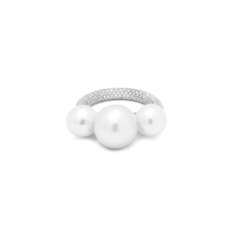 Harnessing the movement of the planets, the Equinox Pearl 18k white gold ring is set entirely with white pave diamonds and crowned with three of the finest South Sea white pearls. Whether worn on its own or stacked next to other MAOR rings, this is a foundational piece for every collector.
