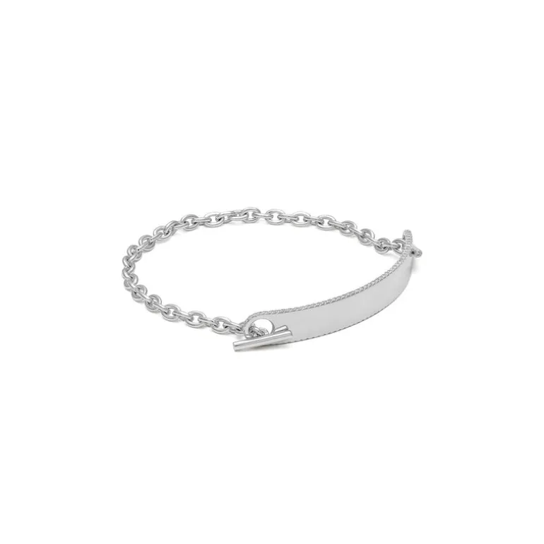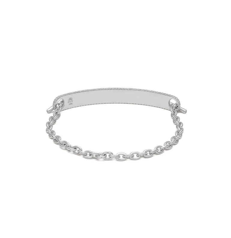 Reinventing a classic, the solid 18k white gold ID bracelet is expertly set with pave white diamond detailing throughout. At the intersection of edge and elegance, this top seller is easily personalized with custom engraving. With the 50mm slimmer bar for women, the 7mm is the midpoint of three choices.