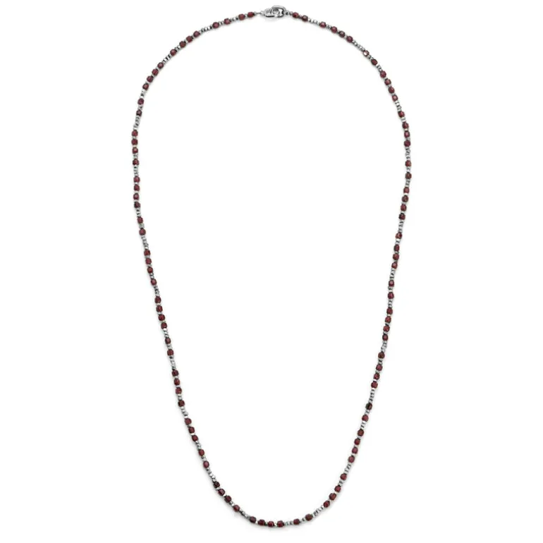 The Percep Necklace / Bracelet is handcrafted with expert precision using 925 sterling silver, providing a durable and high-quality piece of jewelry. Its unique kissing closure allows for a customizable fit as both a necklace and bracelet. Adorned with garnet, this versatile accessory adds a touch of elegance to any outfit.