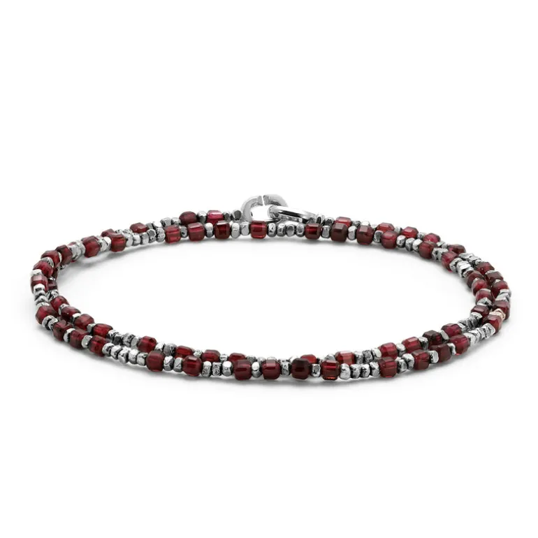 Indulge in the elegance of the Percep Two Wrap Bracelet. Hand crafted with 925 sterling silver and embellished with striking garnet, its sophisticated two wrap design and secure kissing closure make it perfect for any occasion. Elevate your style with this luxurious accessory.
