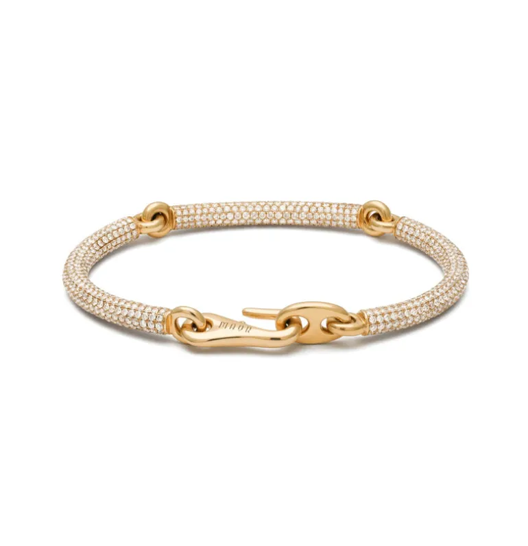 Introducing one of MAOR’s most sought-after piece. The modern yet timeless design redefines a modern classic. It’s three solid 18k yellow gold rounded bars are enveloped entirely with honeycomb pave white diamonds. The orbital pattern allows each stone to project unprecedented brightness while making maximum direct contact with the skin.