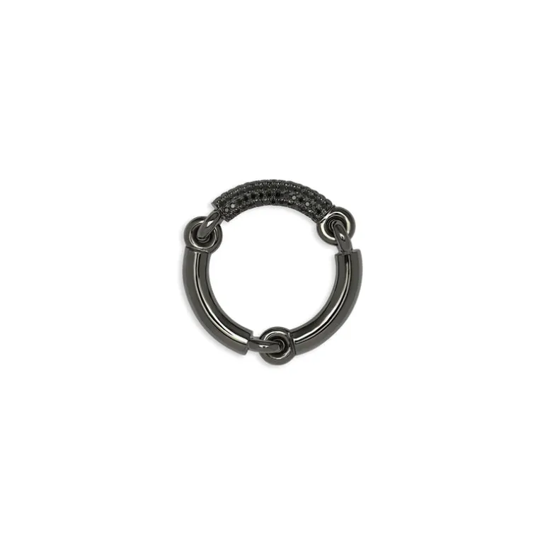 Embodying constant movement within perfect balance, the single honeycomb pave black diamond bar floats effortlessly between two links of black rhodium coated solid 18k white gold. This Solstice is expertly crafted to be worn as a solo statement piece or elevate any stack of complementary rings.