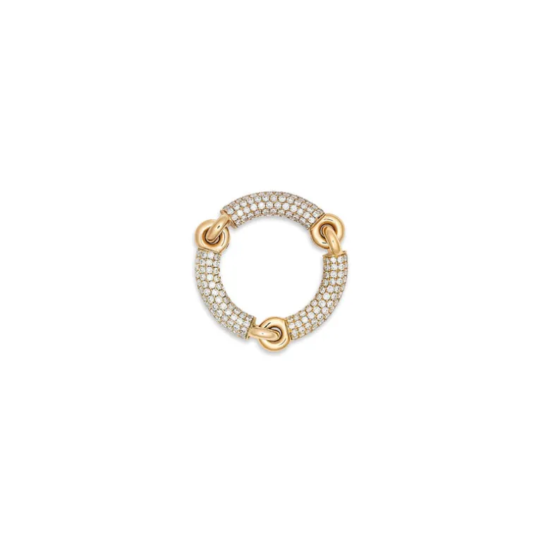 This modern yet timeless design redefines modern classic. The three solid 18k yellow gold rounded bars are enveloped entirely with honeycomb pave white diamonds. The orbital pattern allows each stone to project unprecedented brightness while making maximum direct contact with the skin.