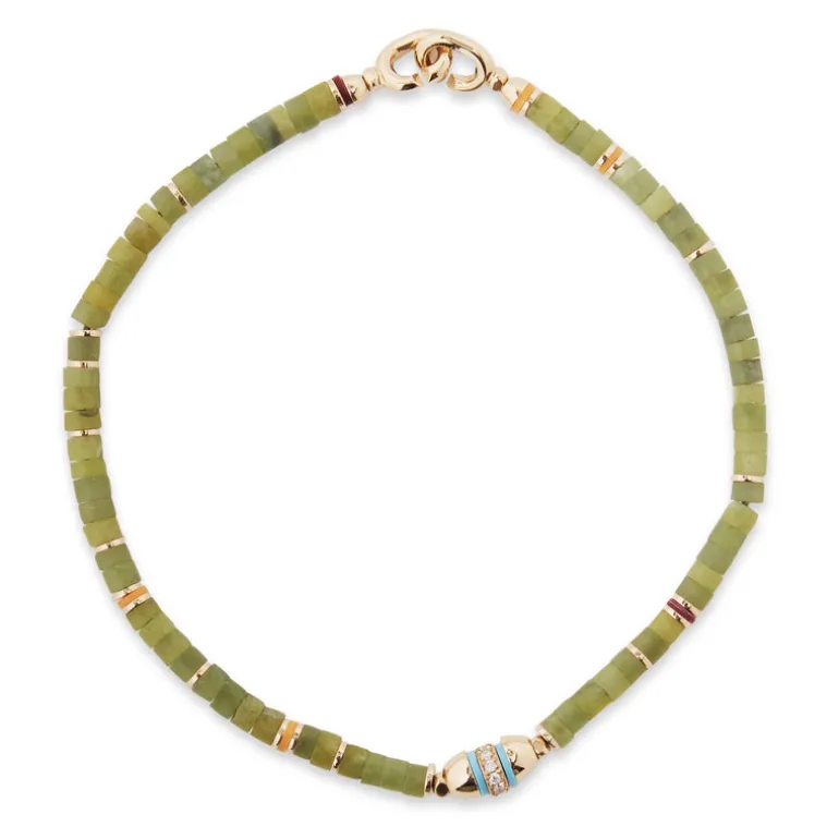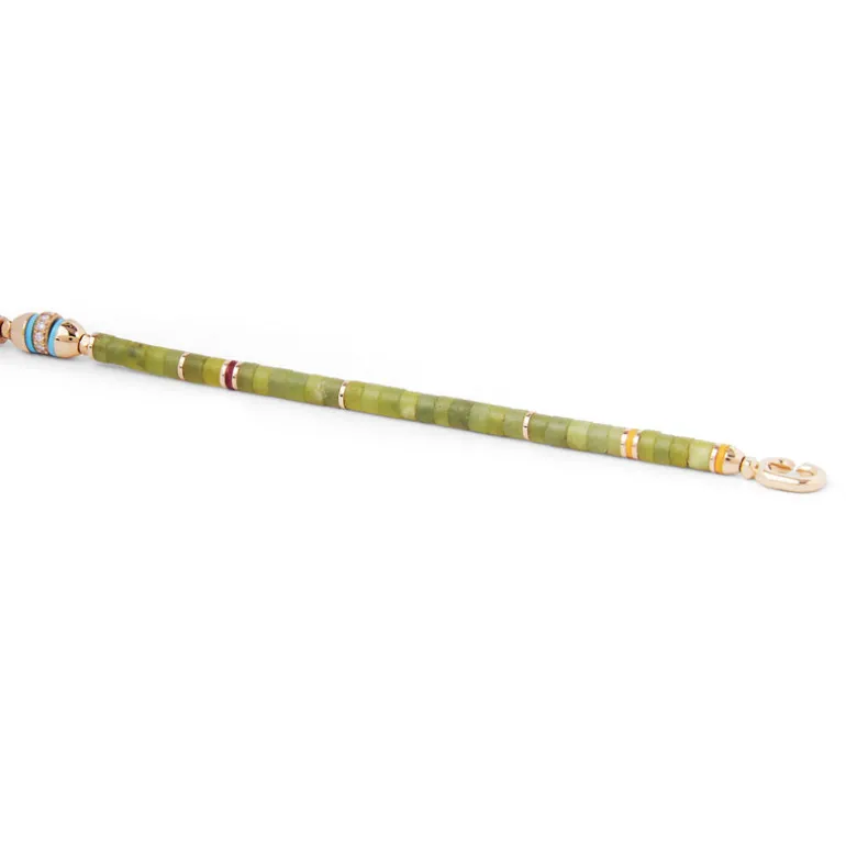 The Cherish, a beautiful piece that provides a subtle addition of color to any stack. Made with fine green-pattern Afghan Jade, 18k yellow gold and white diamond bead accent, it can be paired with any of your favorite MAOR bracelets.