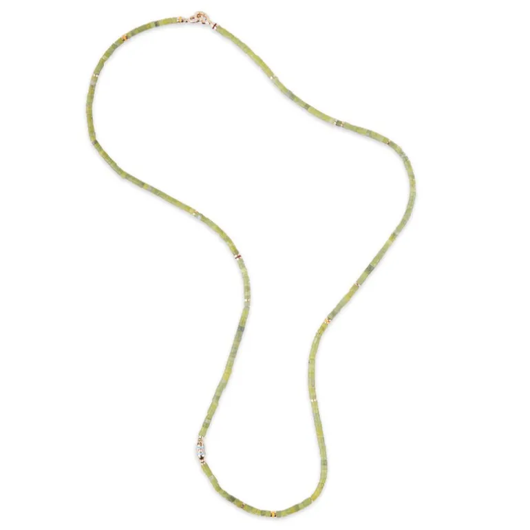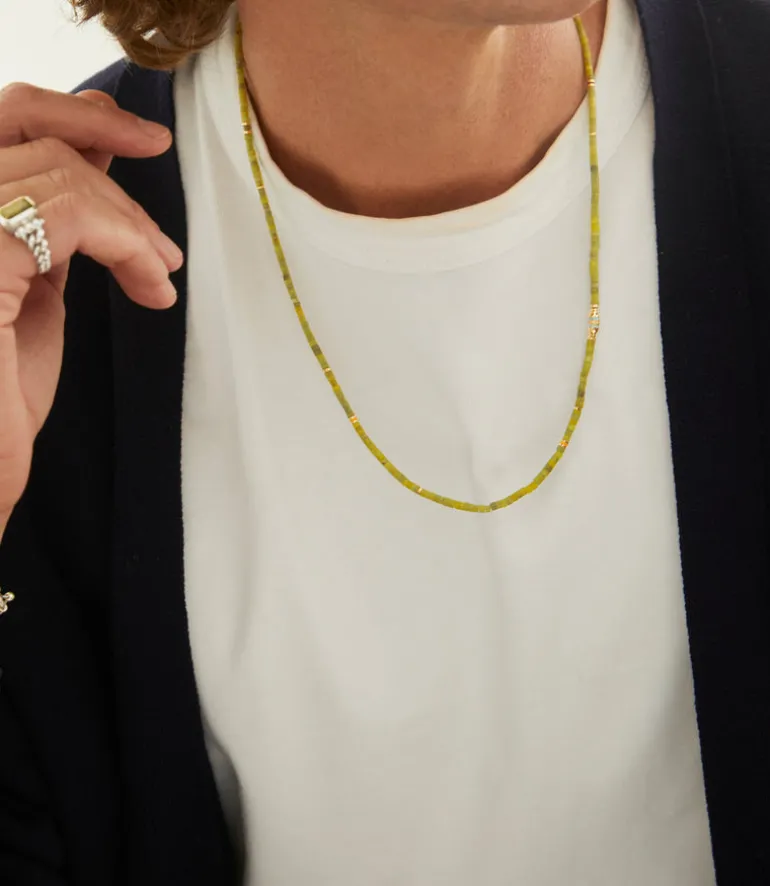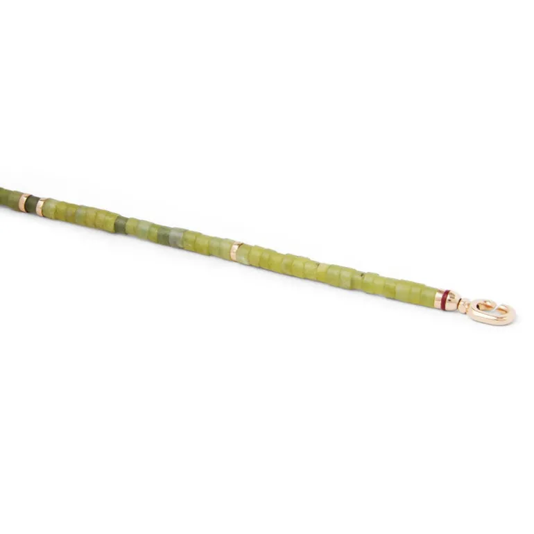 The Cherish, a beautiful piece that provides a subtle addition of color and be worn as a necklace or bracelet. Made with fine green-pattern Afghan Jade, 18k yellow gold and white diamond bead accent, it can be paired with any of your favorite MAOR Necklaces or as a base for your stack.