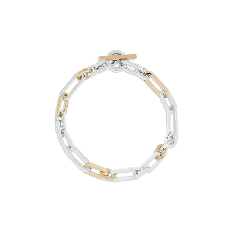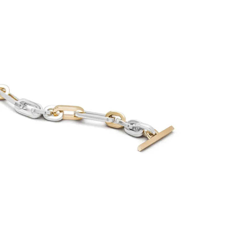 Embracing the design of the interlocking links of varying sizes, the mixed solid 18k yellow gold and solid 925 sterling silver pattern Cuadro bracelet is a bold statement piece. Wear it solo or stacked with a MAOR bangle or beaded bracelet.