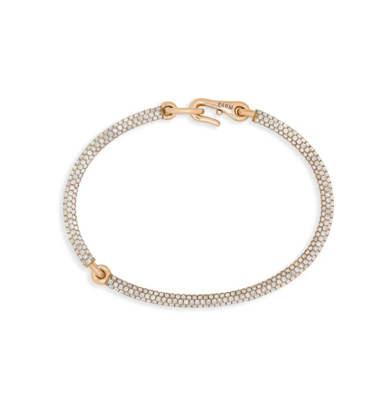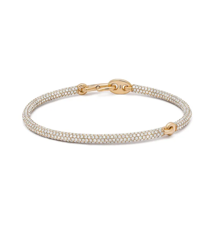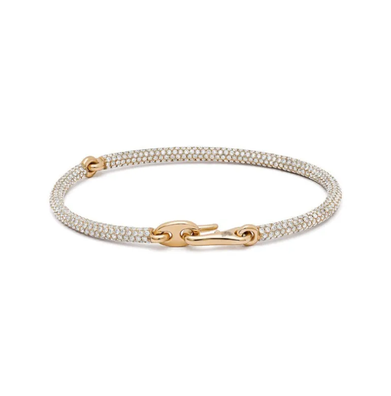 Reinventing the Solstice design with two moving parts, the solid 18k yellow gold rounded bars are enveloped entirely with honeycomb pave white diamonds. The uniquely placed link pairs a modern twist with timeless design. Wear the Equinox as a statement piece, with other MAOR bangles or in a stack of complementary bracelets.