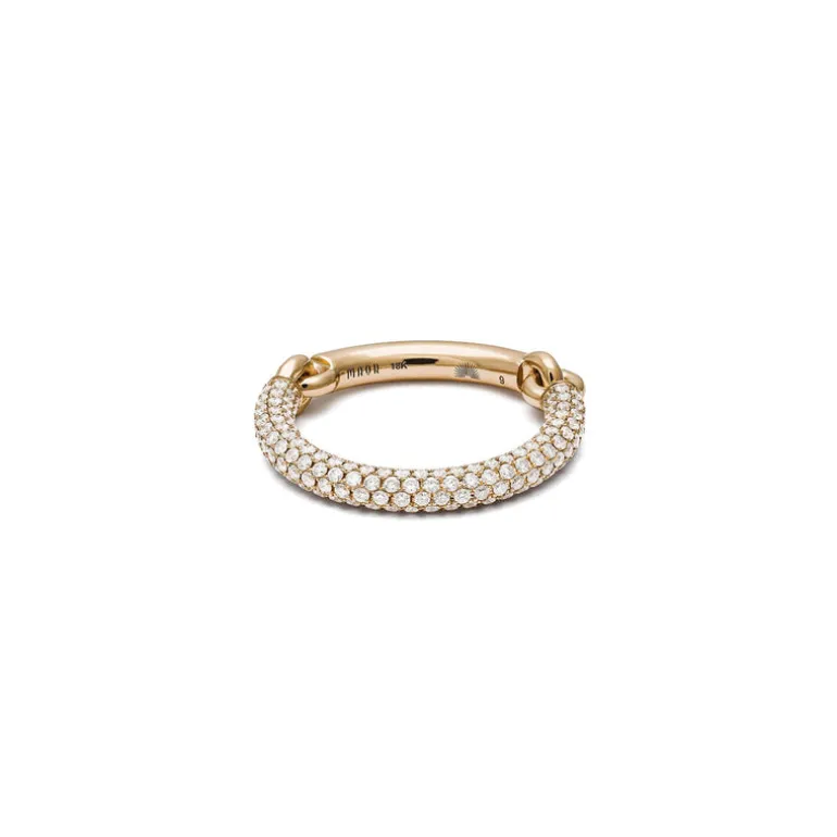 Embodying constant movement within perfect balance, the single white diamond honeycomb 2/3 pave bar is uniquely placed with a link of solid 18k yellow gold. Wear this Equinox as a statement piece or in a stack of complementary rings.