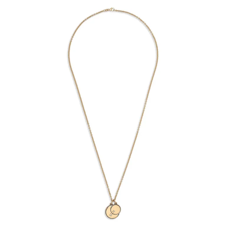 The Gudo Round necklace is a statement of simplicity and sophistication. Made in 18k yellow gold and adorned with a single pave white diamond on each charm, wear this piece as a solo statement or stacked with other MAOR necklaces.