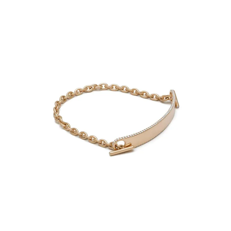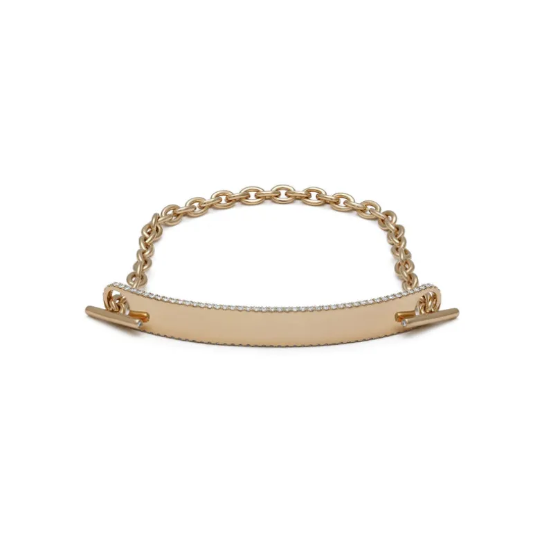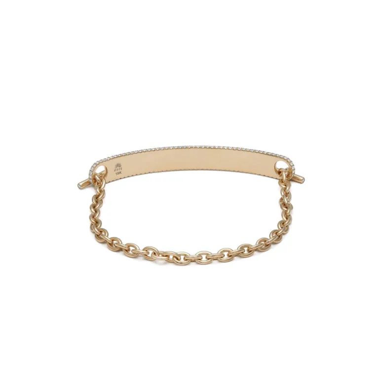 Reinventing a MAOR classic, the solid 18k yellow gold ID bracelet is expertly set with pave white diamond detailing throughout. At the intersection of edge and elegance, this top seller is easily personalized with custom engraving. With the 50mm slimmer bar for women, the 7mm is the midpoint of three choices.