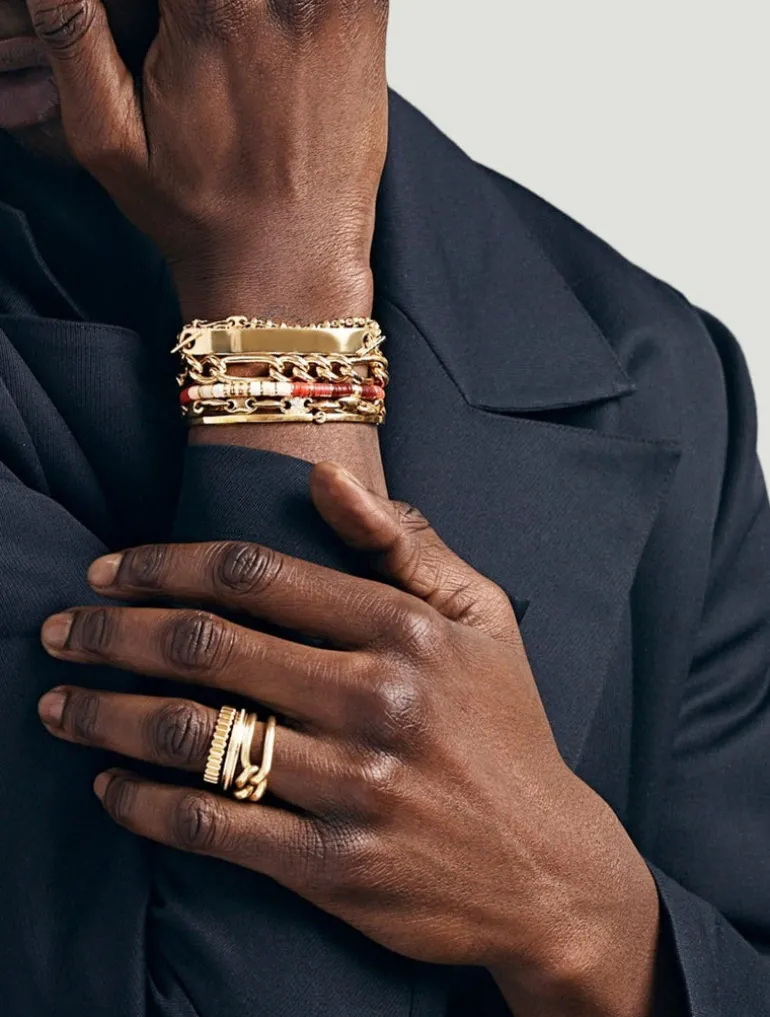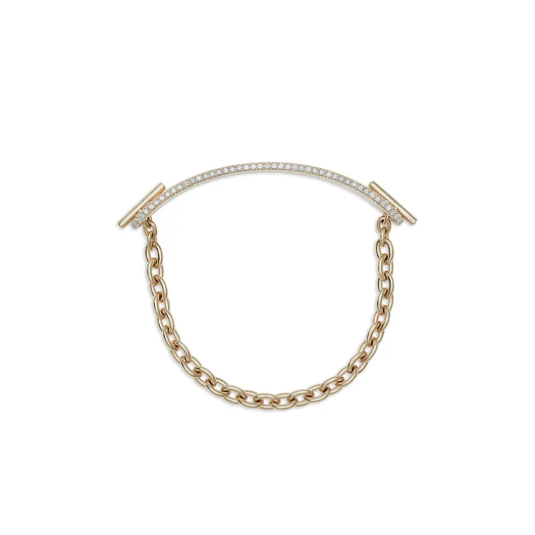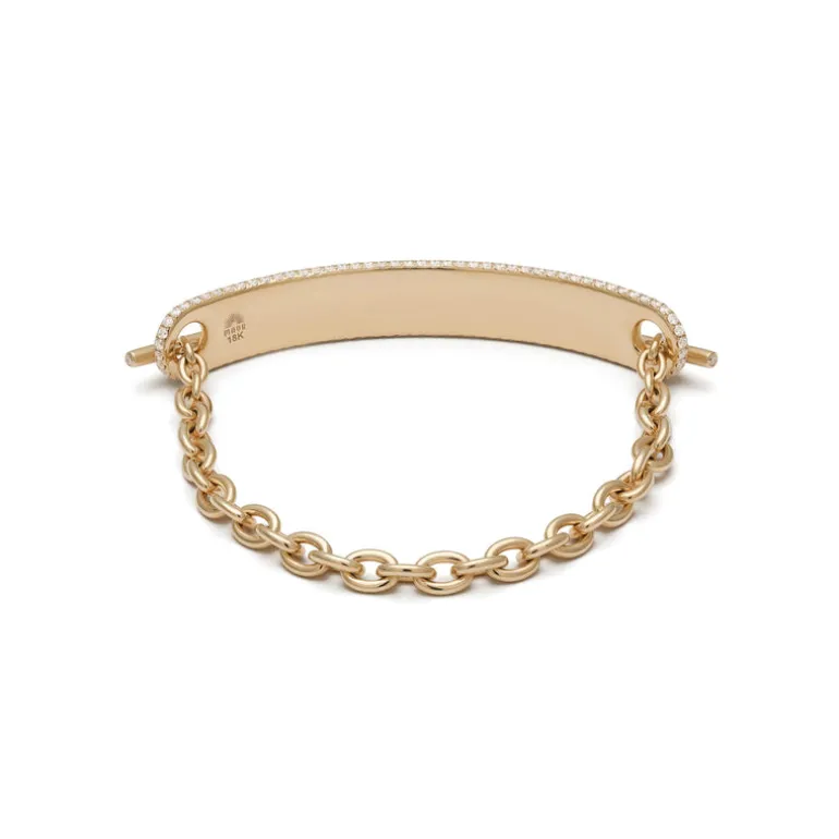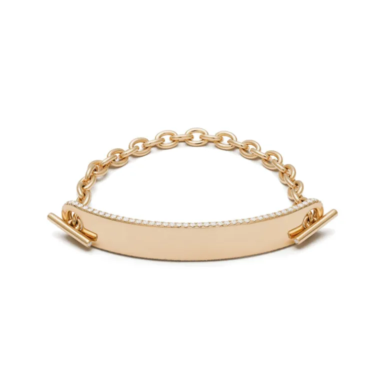 At the intersection of edge and elegance, the solid 18k yellow gold ID bracelet makes a bold statement with the edged white diamond pave. For men we offer the 70mm wide bar, and here seen in 11mm height as the largest of the choices.