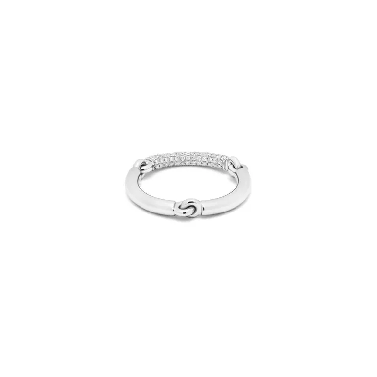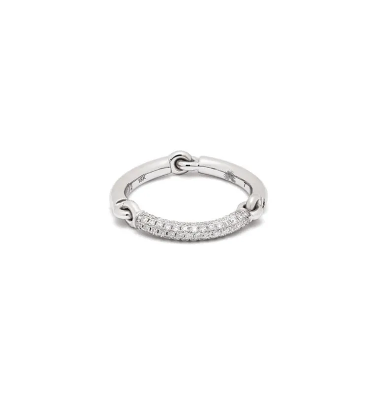 Harnessing the movement of the planets into solid 18k white gold with 1/3 white diamond pave, the three-part Lyra ring is a foundational piece for every collector. This ring is designed to live on the hand as a permanently empowering force for its owner. Wear alone for simplicity or together with complimentary MAOR rings.