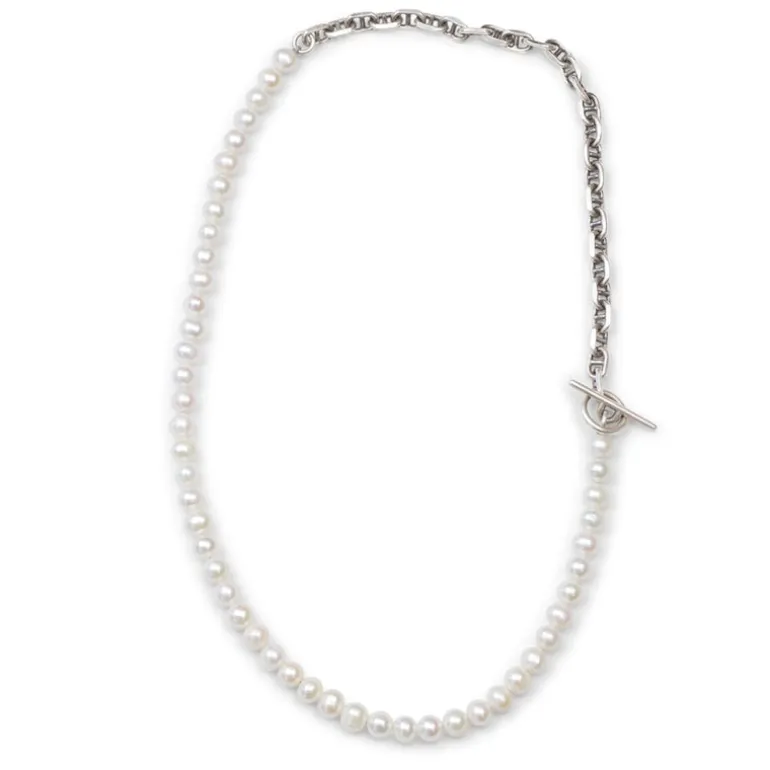 The modern fresh water white pearls necklace with an edgy addition of 925 sterling silver chain, perfect as a unisex item. We recommend the short look amongst other MAOR necklaces.