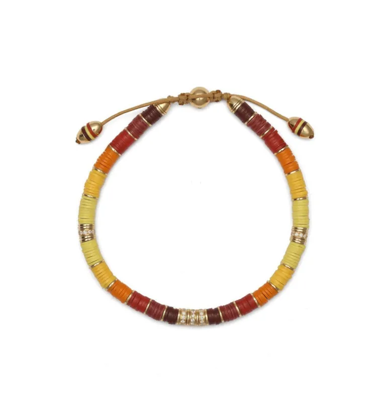 The Rizon, a foundation piece from the designer, provides an addition of color to any stack. Made using 18k yellow gold discs, white diamond pave and authentic African trade beads, which in small tribes through out the continent are used as currency, and based on color, signify emotions. Wear paired with your favorite MAOR bracelets.