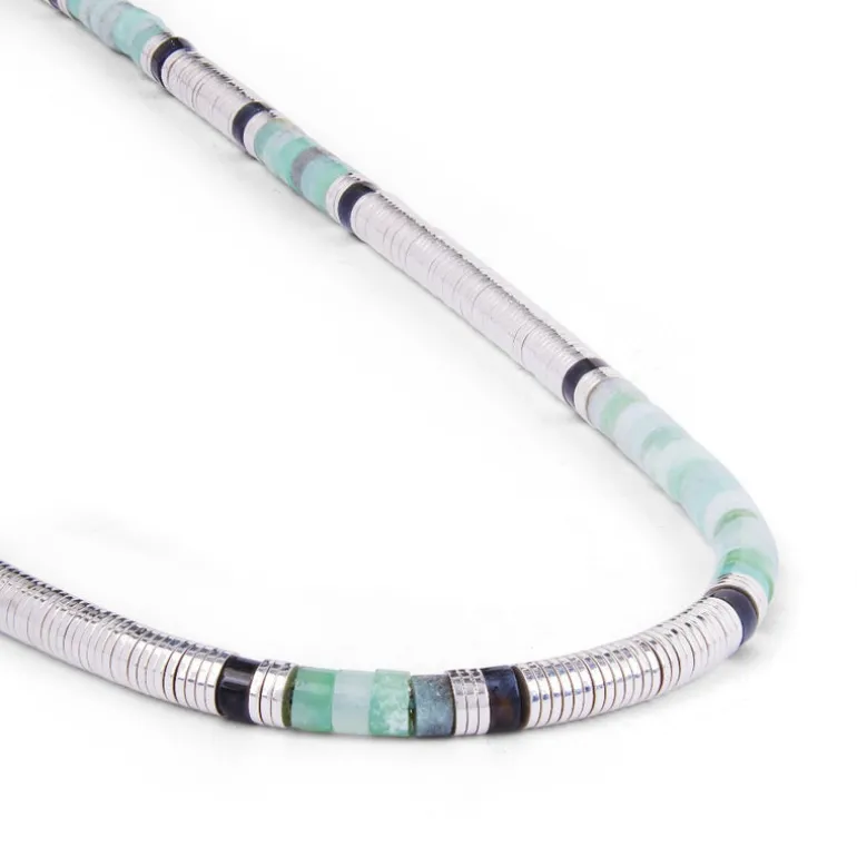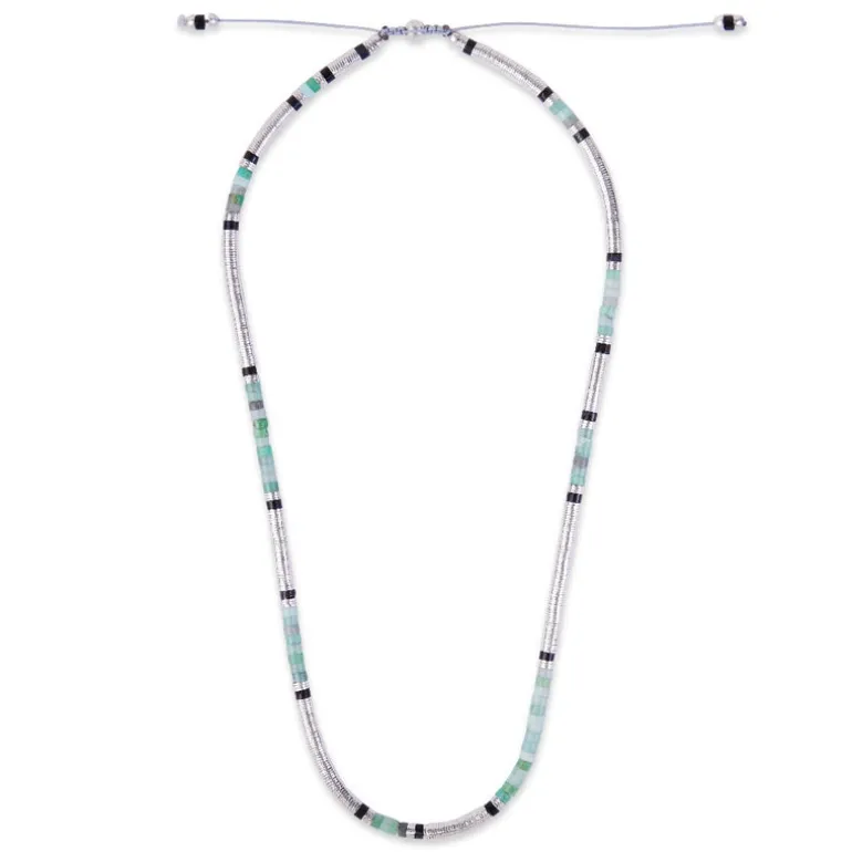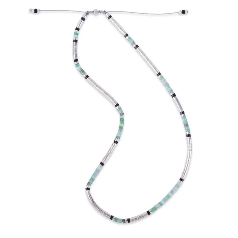 Crafted with genuine sterling silver, the Sonoran Necklace features a stunning mix of African trade beads and chrysoprase gemstones. Perfect for adding a touch of elegance to any outfit, this necklace is sure to make a statement with its unique design. Elevate your style with this expertly crafted piece.