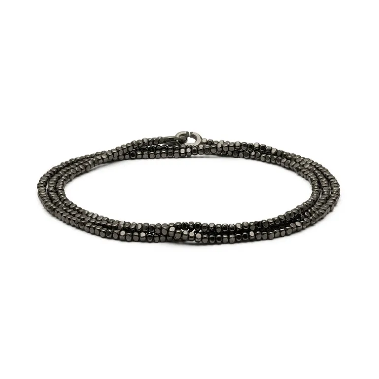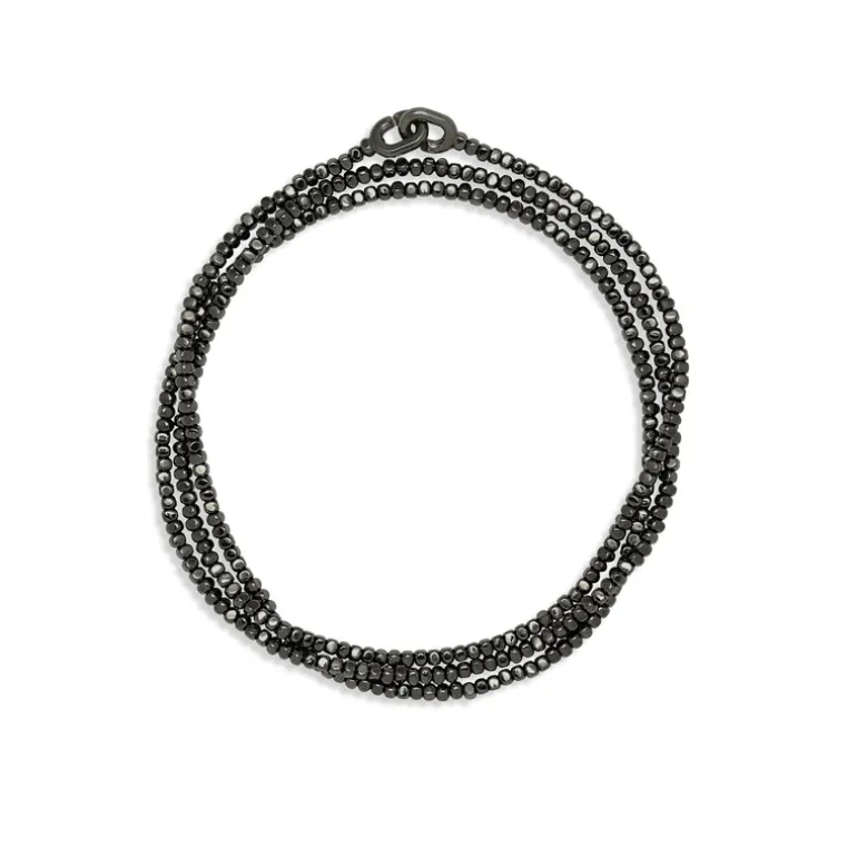 Raw and yet refined with 18k black gold corner-less beads, the craftsmanship finds each individual element hand beaded to precision each time. Whether worn alone or stacked next to other MAOR complementary pieces, the Noix is beautiful and classic to be worn as a three wrap bracelet or necklace.