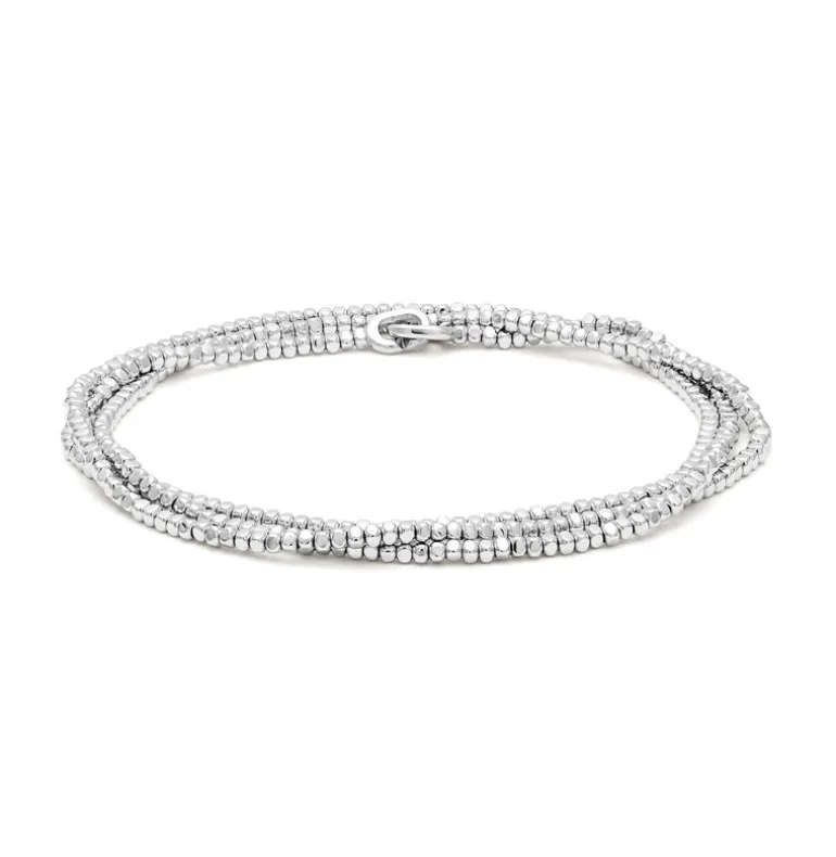 Raw and yet refined with 18k white gold corner-less beads, the craftsmanship finds each individual element hand beaded to precision each time. Whether worn on its own or stacked next to other MAOR complementary pieces, the Noix is beautiful and classic to be worn as a three wrap bracelet or necklace.